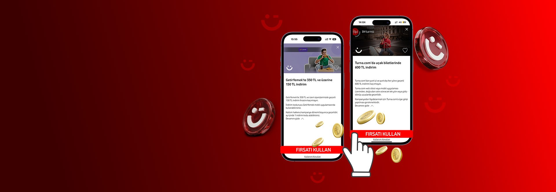 Vodafone Happy, Vodafone bireysel kullanıcılarının Vodafone Yanımda uygulaması üzerinden erişebileceği, birçok farklı kategoride avantajlı kampanyalar, özel indirimler ve kullanıcıya özel faydalar sunan bir dijital platformdur. Bu platformda, günlük ihtiyaçlarınızdan keyifli aktivitelere kadar birçok konuda kazançsağlayacak içeriklere ulaşabilirsiniz. Vodafone Happy ile dönemsel olarak değişen farklı ve geniş yelpazeli kategorilerde kampanyalar ve indirimler sizi bekliyor! Mevcut tüm kampanyaları keşfetmek için kampanyalar sayfasına göz atabilirsiniz.